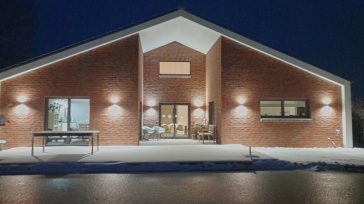 Im 90° Winkel zur Doppelgarage liegt das Wohnhaus, der Eingang liegt direkt am Hofplatz. Die charakteristischen Merkmale dieses Hauses ist zum einen das Satteldach auf einem Bungalow. Die Decke geht im Essbereich frei bis zum First und macht ein tolles Raumgefühl.
